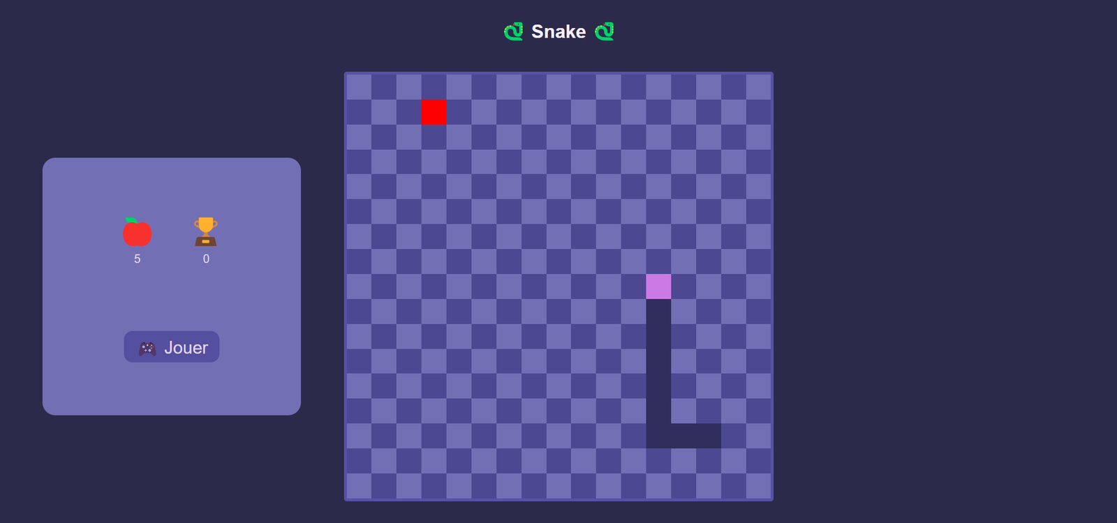 Pour m'entraîner avec JavaScript, j'ai réalisé une version du jeu Snake en utilisant une grille de div. Chaque case de la grille change de couleur pour représenter le serpent, les pommes et les déplacements. Ce projet m'a permis de travailler sur la logique de gameplay, la gestion des interactions clavier, et la manipulation dynamique du DOM. Une approche simple mais efficace pour renforcer mes compétences en JavaScript.